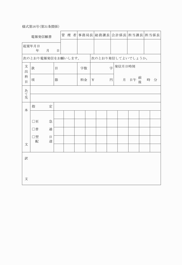 第16条 起案は、起案用紙を用い、次により作成しなければならない。ただし、物件の購入請負契約の締結、金銭の収支など、経理に関する起案につき、別に定めがあるものについては、この限りでない。
